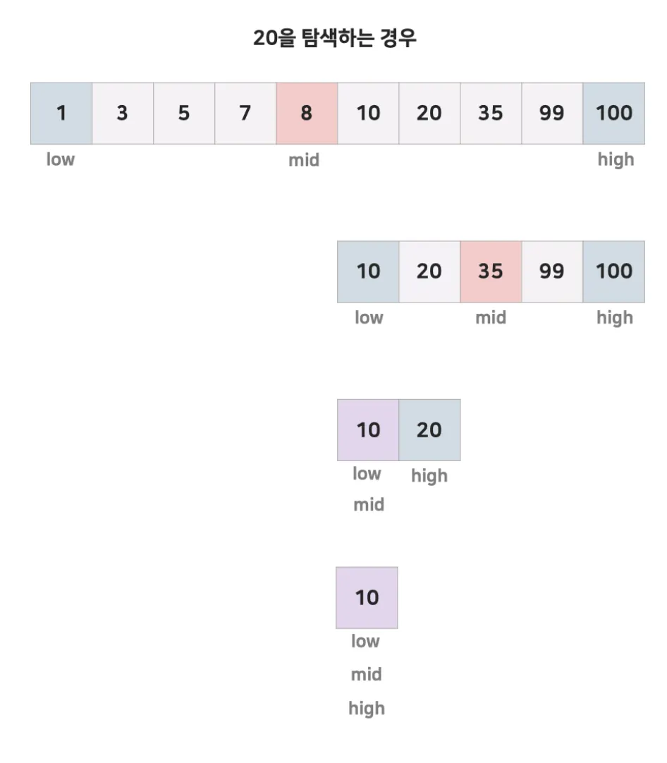 - 즉, 어떤 시점에서 탐색되어야할 범위는 low ~ high까지가 된다.
