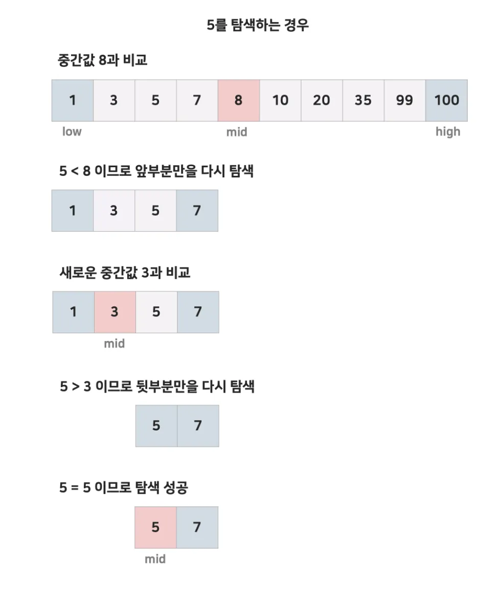 - 중간 값이 찾고자 하는 값보다 작으면 ‘배열 오른쪽 부분’에서 탐색을 진행